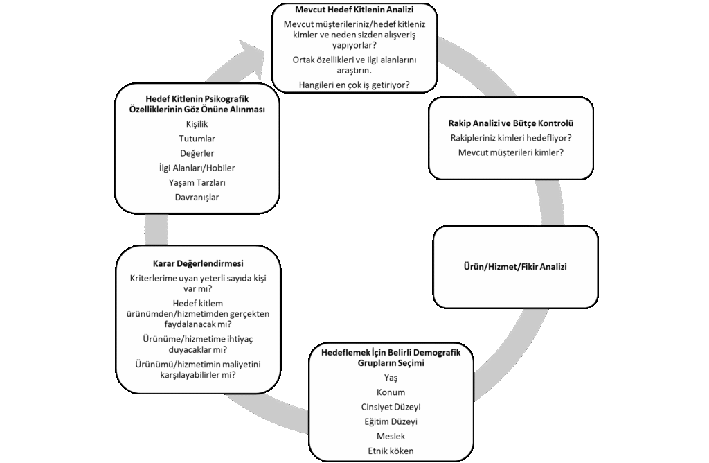 Yanlış kişilere yanlış şekilde gönderilen her mesaj kaynak için zaman, para ve çaba israfı anlamına gelmektedir (Tosun vd., 2018, s. 258). Hedef kitle belirlemenin potansiyel müşterilere ulaşma konusunda daha uygun maliyetli, verimli ve etkili bir yolu olduğunu ifade eden Dahikar’ın (2020) altı aşamalı temel hedef kitle analiz süreci Şekil 1’de yer almaktadır.